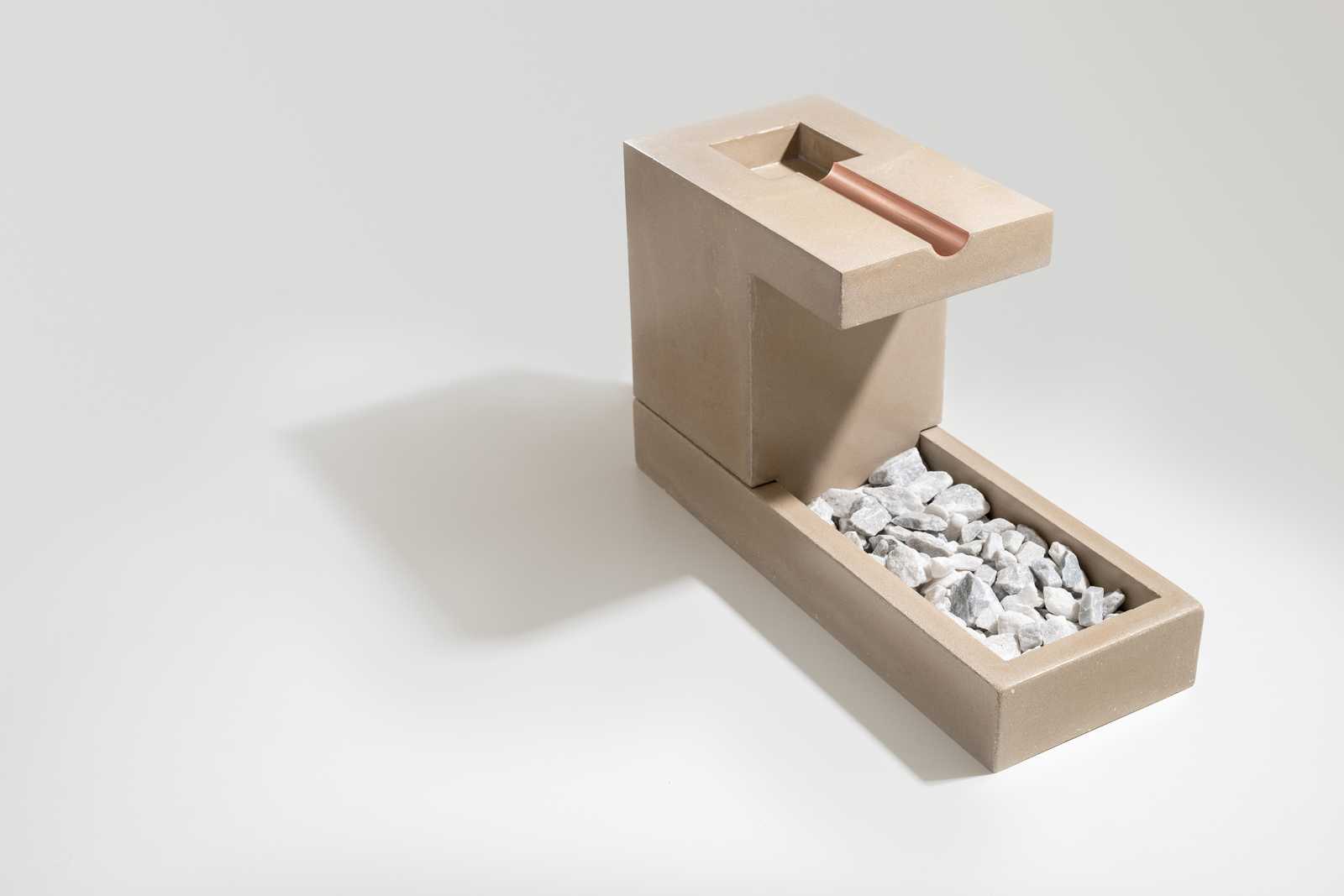 -- Love mixed materials Metal + concrete -> half copper pipe. -- Shape very much dictated by the form I could build with my limited tools (angles were out). -- Form built with a mix of 3D printed components and a melamine shell --- Melamine exterior --- 3D-printed TPU component used to create the cavity in the top and to aid in aligning the copper tube. --- PLE component use to create the inner cavity for the pump and for positioning pipes for the water inlet, water outlet, and electrical cable. -- Material: Glass-fiber reinforced concrete with Integrity PowerPack and a healthy dose of Integrity Ultraflow superplasticizer.